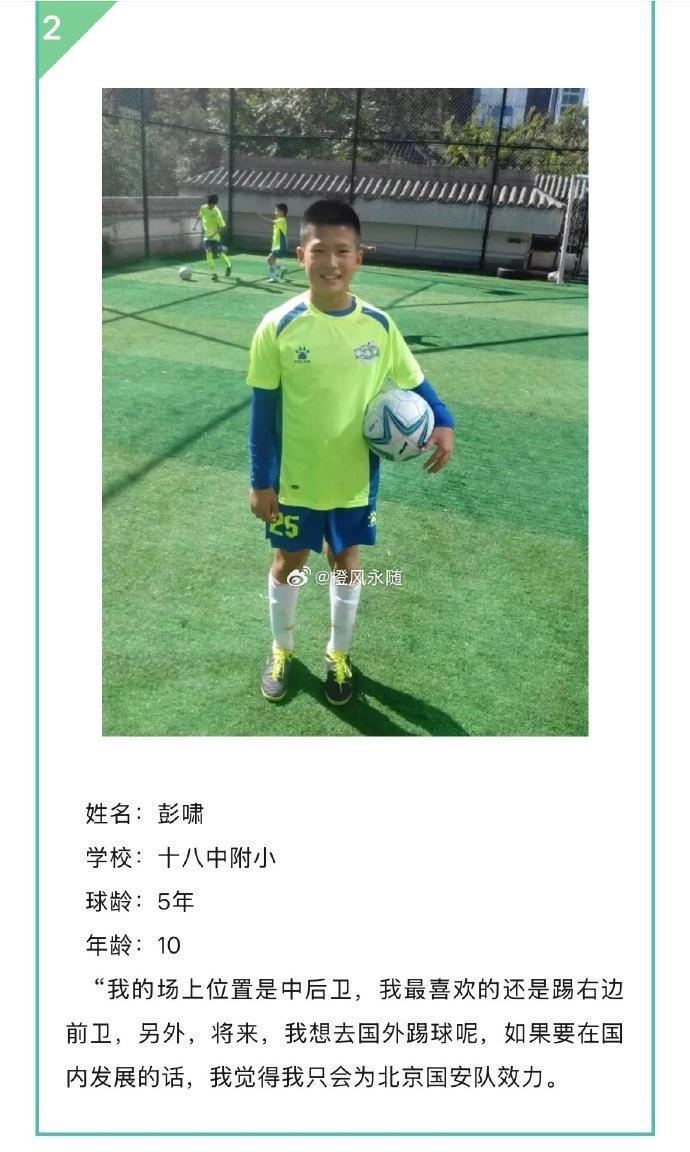 早在2015年,当时只有10岁的彭啸则接受采访时表示,“如果要在国内发展的话,我觉得我只会为北京国安效力。”